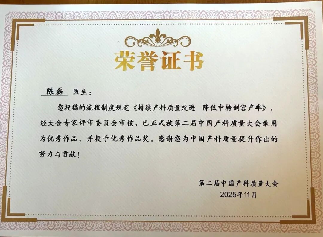 近日,2025第二届中国产科质量大会在山东济南召开,我院产科质控中心陈磊团队报送的《持续产科质量改进,降低中转剖宫产率》,在大会评审中脱颖而出,荣获优秀作品奖,并受邀大会发言,进行成果分享。