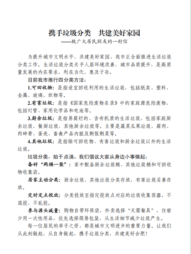 携手垃圾分类 共建美好家园——致广大居民朋友的一封信