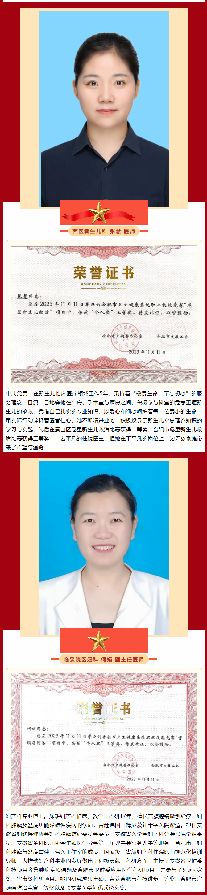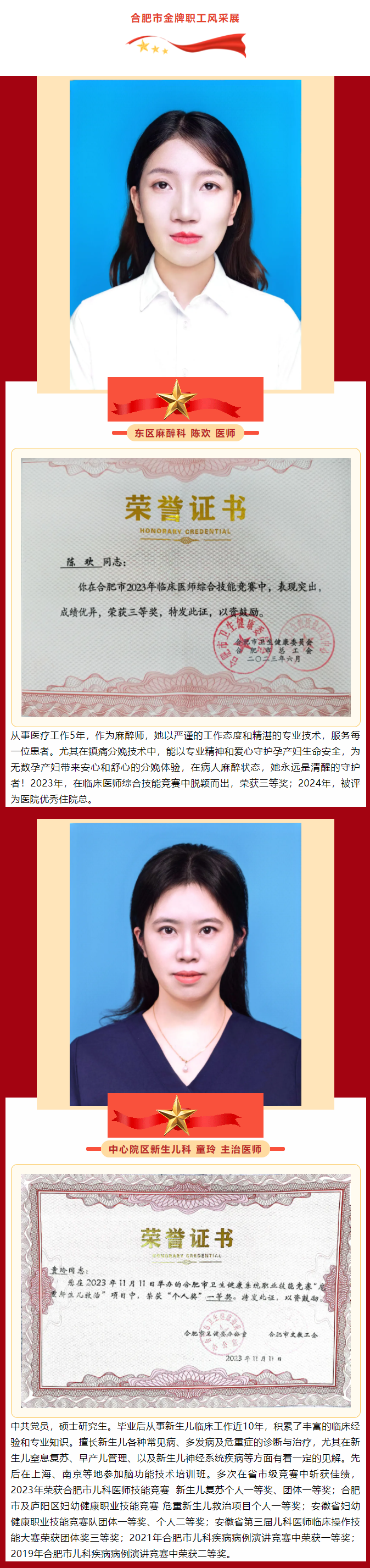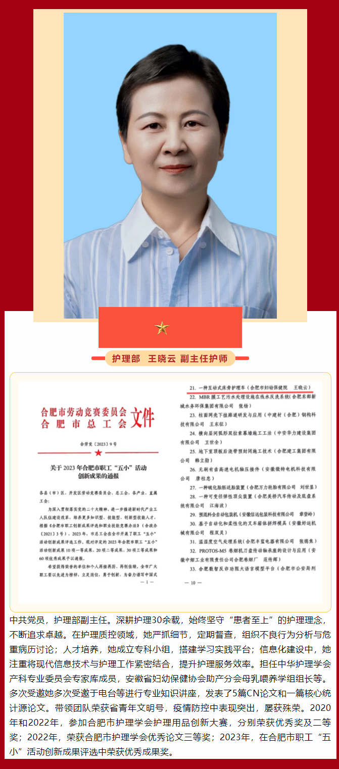 在全市各级工会组织深入学习贯彻党的二十大精神,坚持以习近平新时代中国特色社会主义思想为指导,积极推动职工技能提升和创新发展,进一步调动广大职工学技术、钻业务、强素质的积极性的良好氛围下,近日,合肥市总工会印发了《关于认定合肥市2023年度职工创新竞赛优胜选手“合肥市金牌职工”的通报》,我院陈欢、童玲、张楠、马翠侠、杨艳、刘书华、张慧、何娟、王晓云等9名职工凭借出色的专业技能和卓越的创新能力,荣获合肥市金牌职工称号。