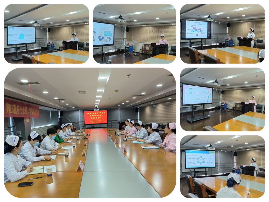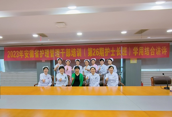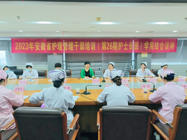 2023年5月17日下午,安徽省护理管理干部培训(第26期护士长培训班)学用结合讲评在我院中心院区保健中心大楼18楼会议室举行,本次讲评由护理部主任许荣华主持,安徽省护理学会监事长郭琼到会指导,来自全省的5位学员及各带教科室护士长参与了此次学用综合讲评报告。