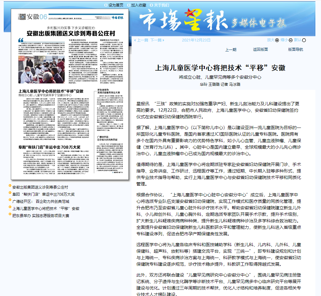 技术平移!上海儿童医学中心牵手安徽省妇幼保健院 将成立心脏、儿童罕见病等多个安徽分中心