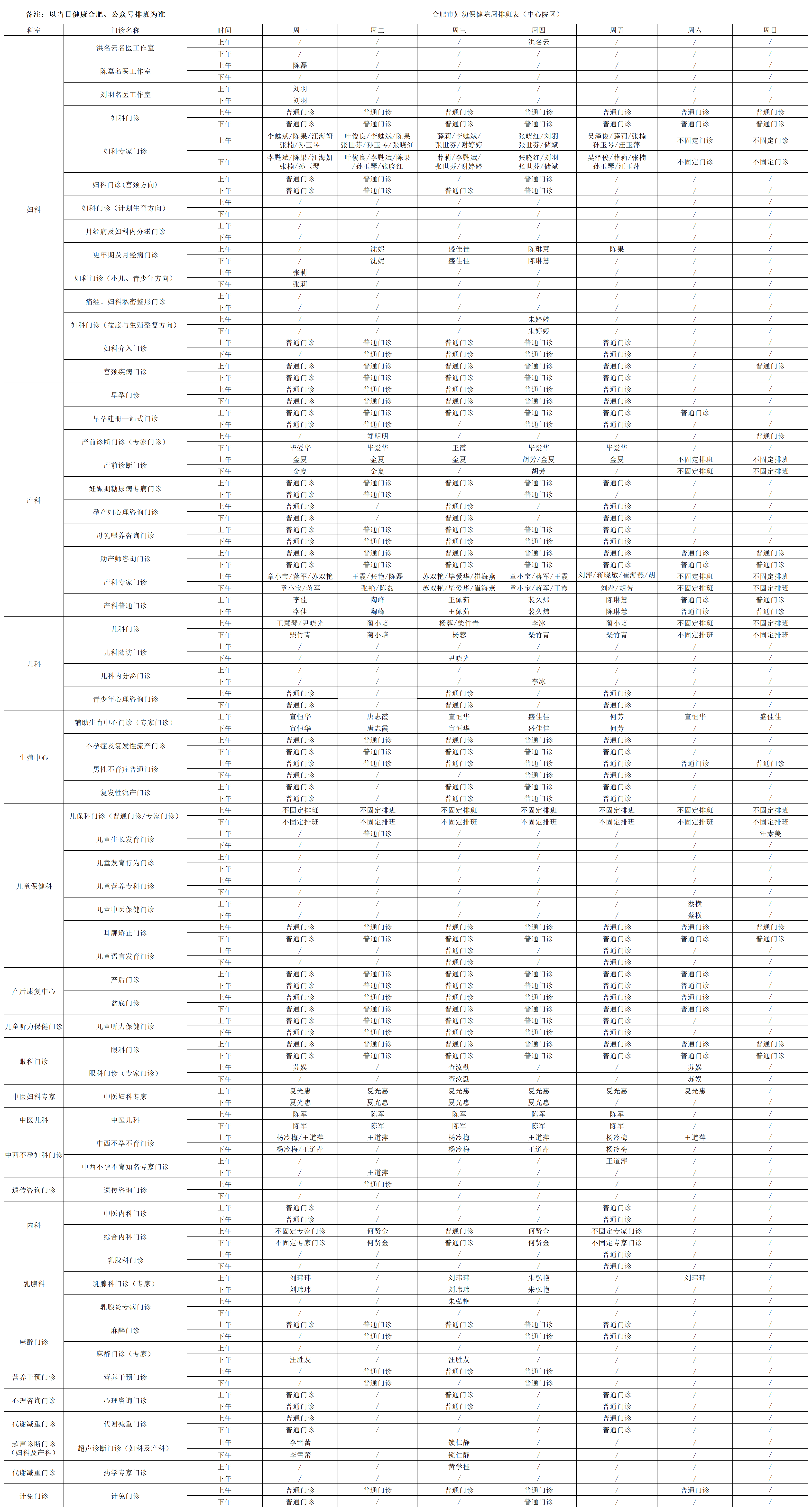 合肥市妇幼保健院周排班表(中心院区)