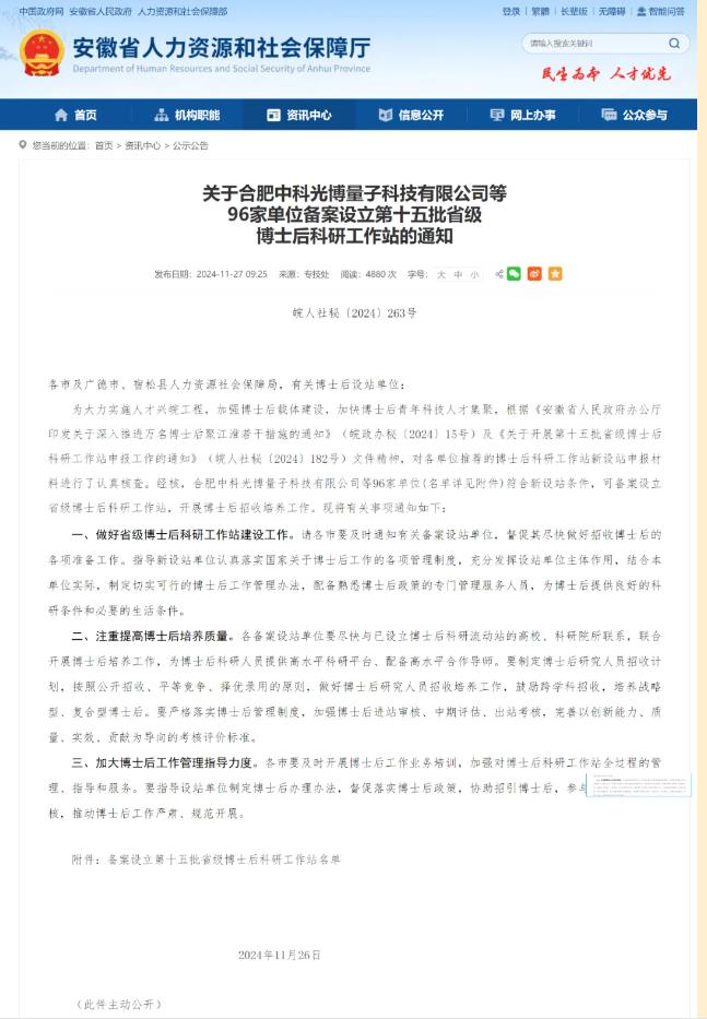近日,安徽省人力资源和社会保障厅发布通知,我院成功获批设立省级博士后科研工作站。