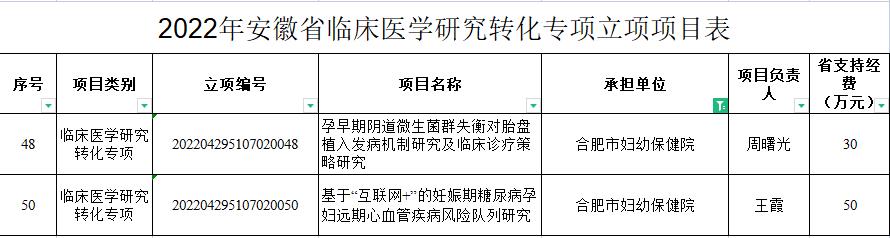 近日,安徽省科技厅公布了2022年安徽省临床医学研究转化专项立项名单,我院妇产科周曙光科研团队主持申报的“孕早期阴道微生菌群失衡对胎盘植入发病机制研究及临床诊疗策略研究”项目(资助经费:30万元),以及妇产科王霞科研团队主持申报的“基于“互联网+”的妊娠期糖尿病孕妇远期心血管疾病风险队列研究”项目(资助经费:50万元)获准立项。